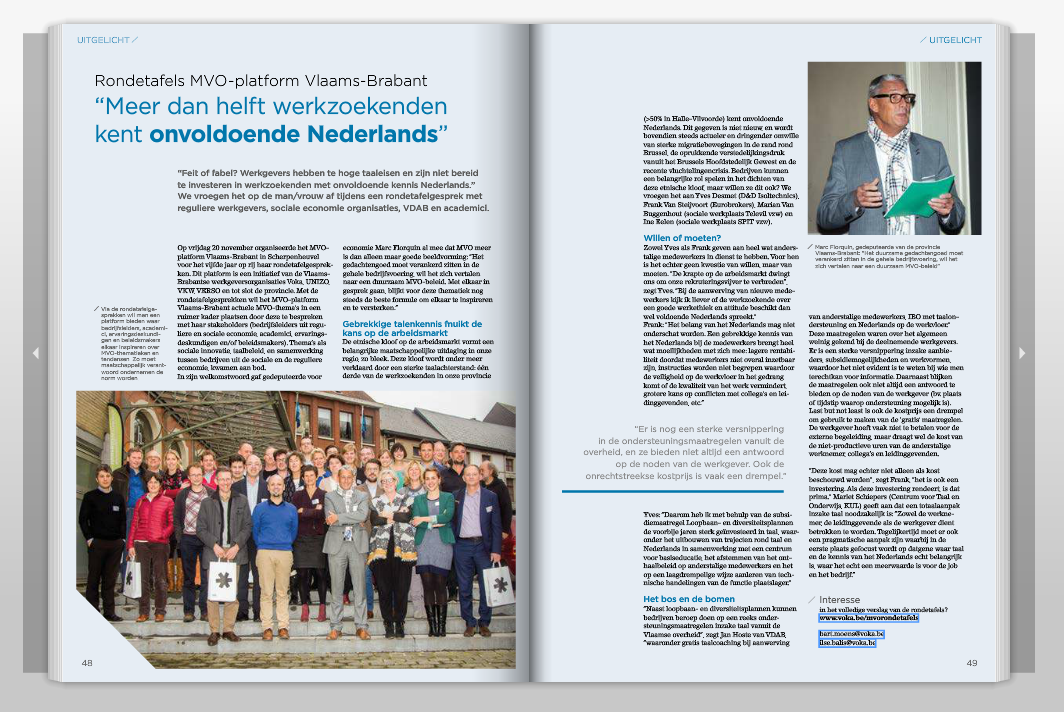 Werkgeversorganisaties UNIZO, Verso, VOKA en het provinciebestuur Vlaams-Brabant slaan samen de handen in elkaar om bedrijfsleiders, academici, ervaringsdeskundigen en beleidsmakers jaarlijks rond de tafel te brengen om deze actuele MVO-thema’s onder de loep te nemen. En dat blijkt een succesformule. Reeds voor de vijfde keer vonden deze ‘rondetafelgesprekken’ plaats. Dit jaar verwelkomde het MVO-platform de 40 deelnemers in eetcafé De Heerlyckheid te Scherpenheuvel.